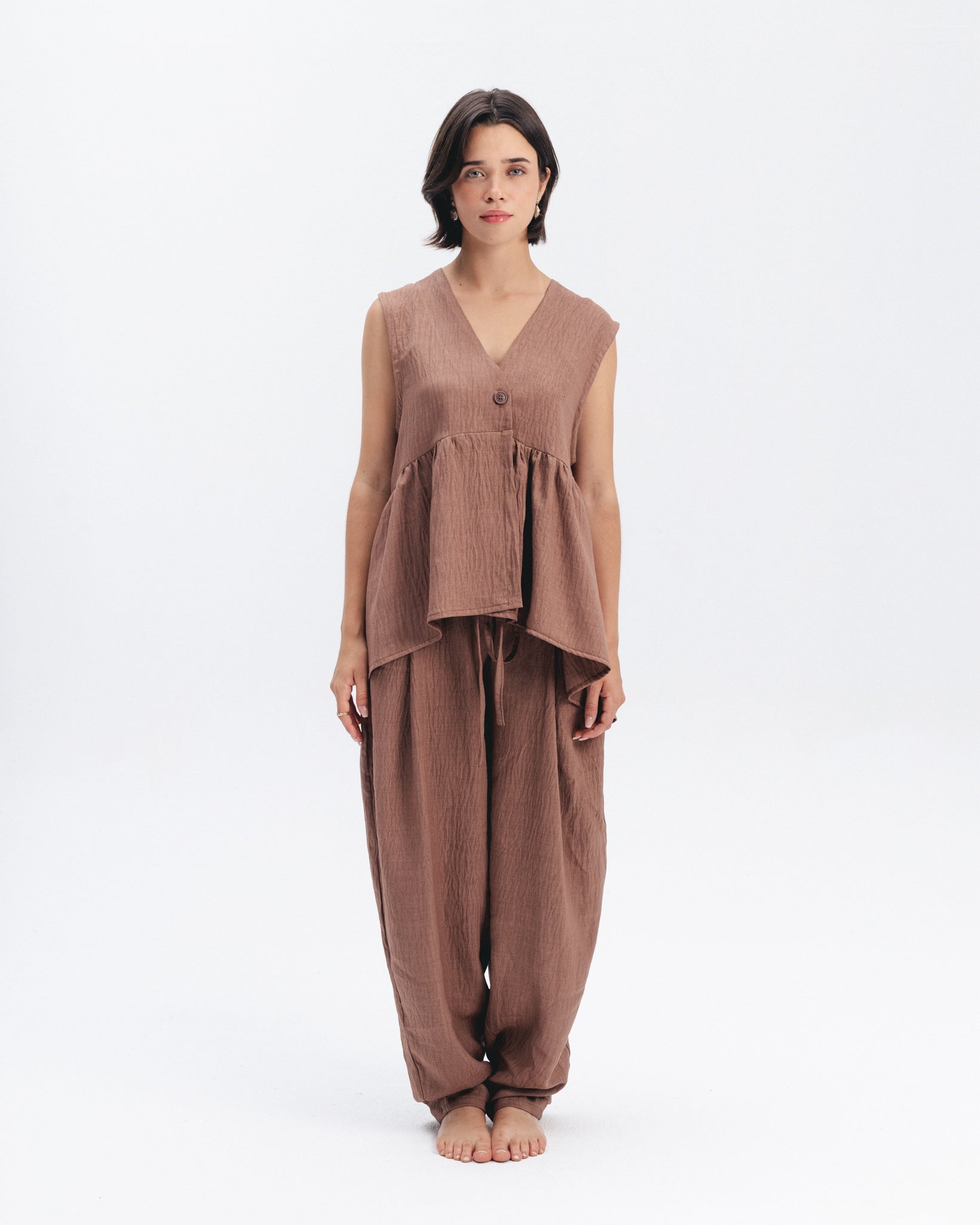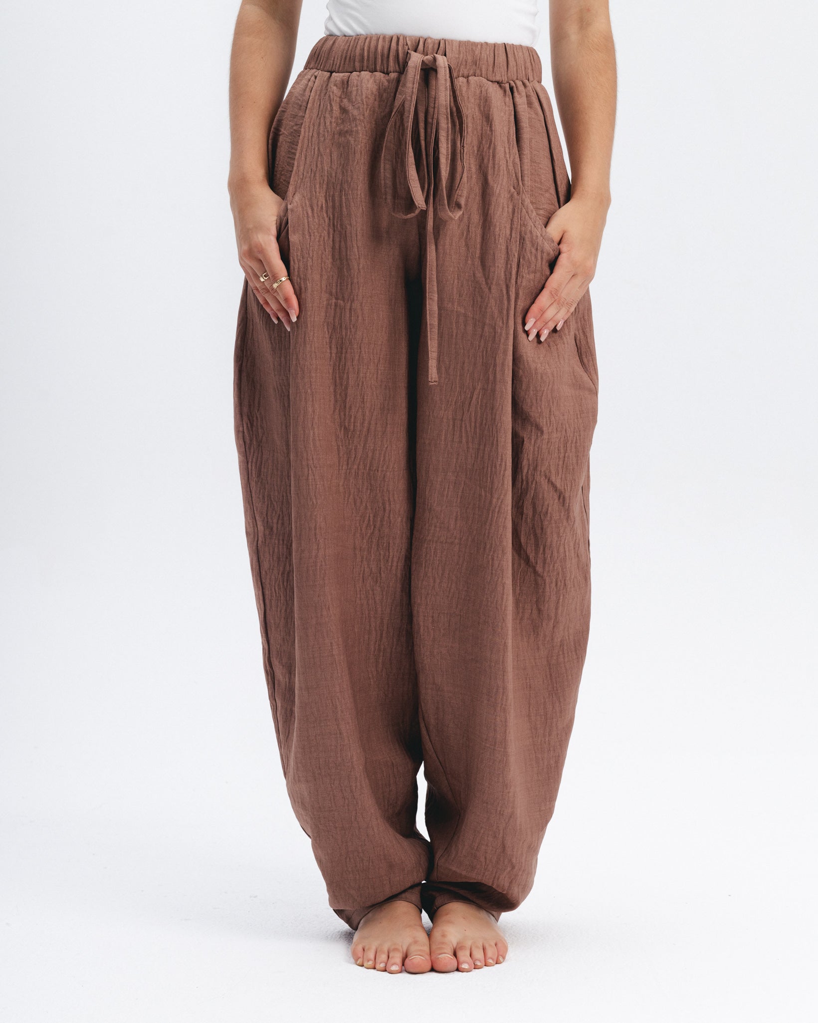 High-waisted balloon pants in a lightweight linen blend. Designed with front pockets, a tapered hem, and an elasticated waistband.