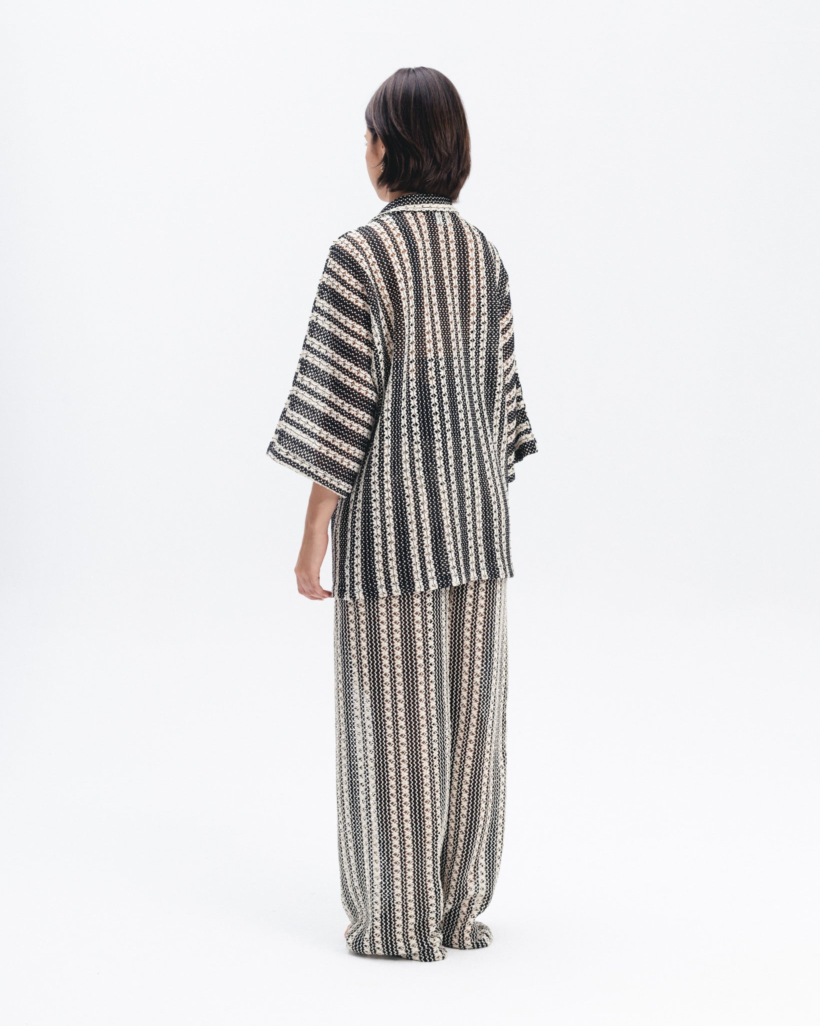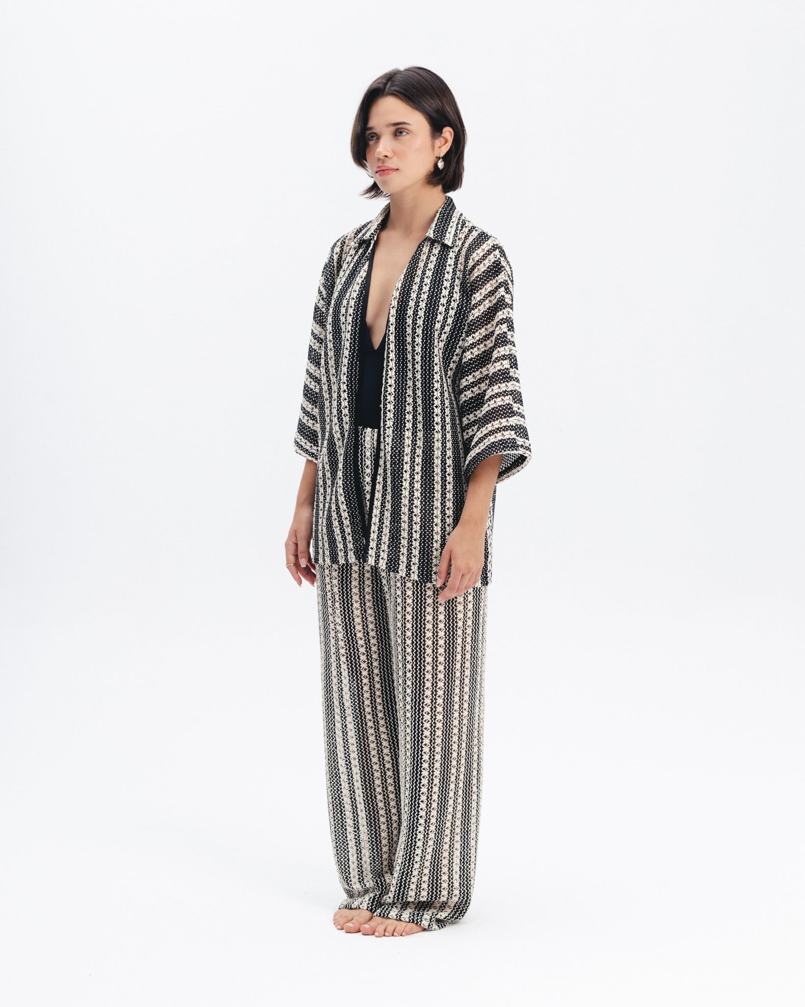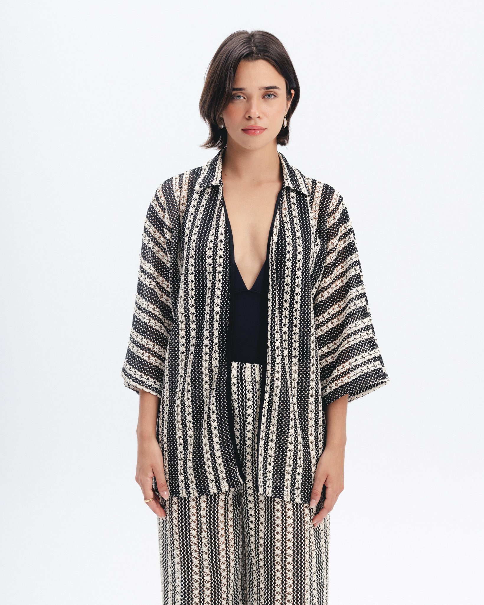 Lightweight open shirt crafted from a textured crochet knit with vertical black and beige stripes. Features a relaxed fit, wide 3/4 sleeves, and a soft collar.