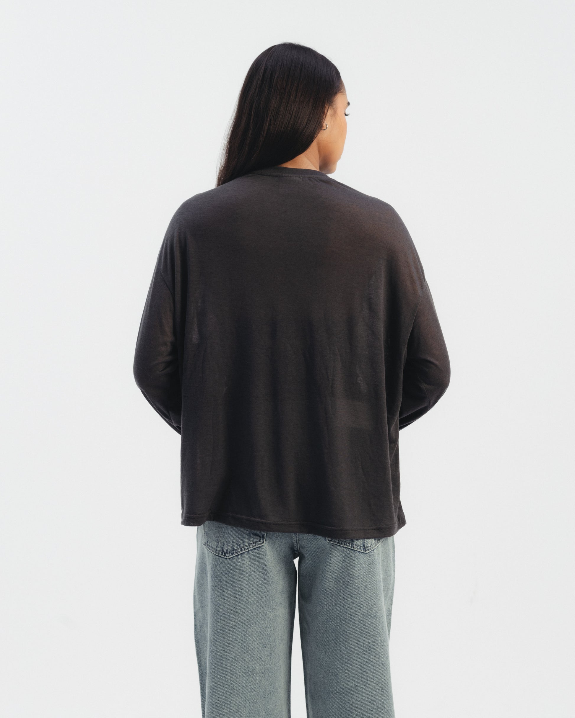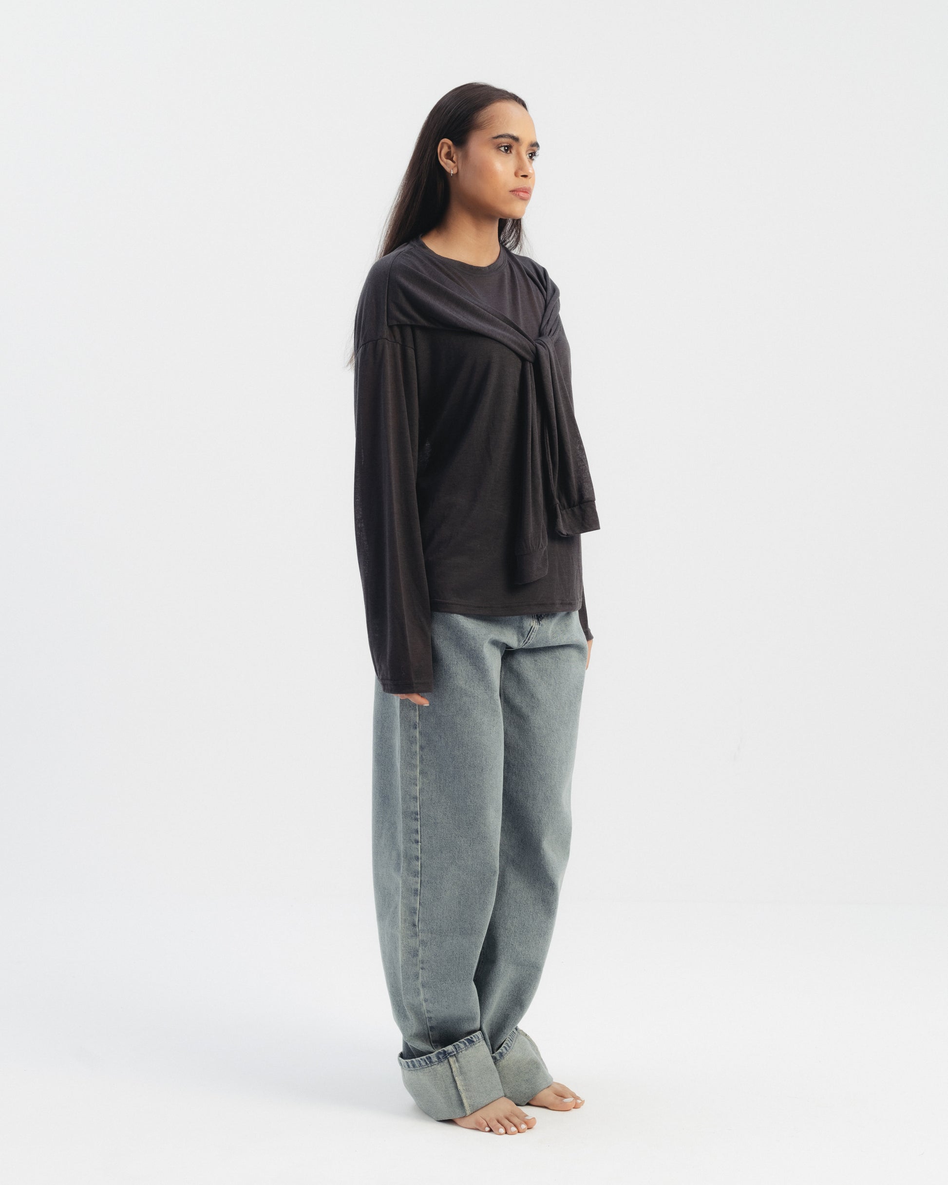 Long sleeve top with double sleeve design and front knot detail. Soft fabric. Relaxed fit.