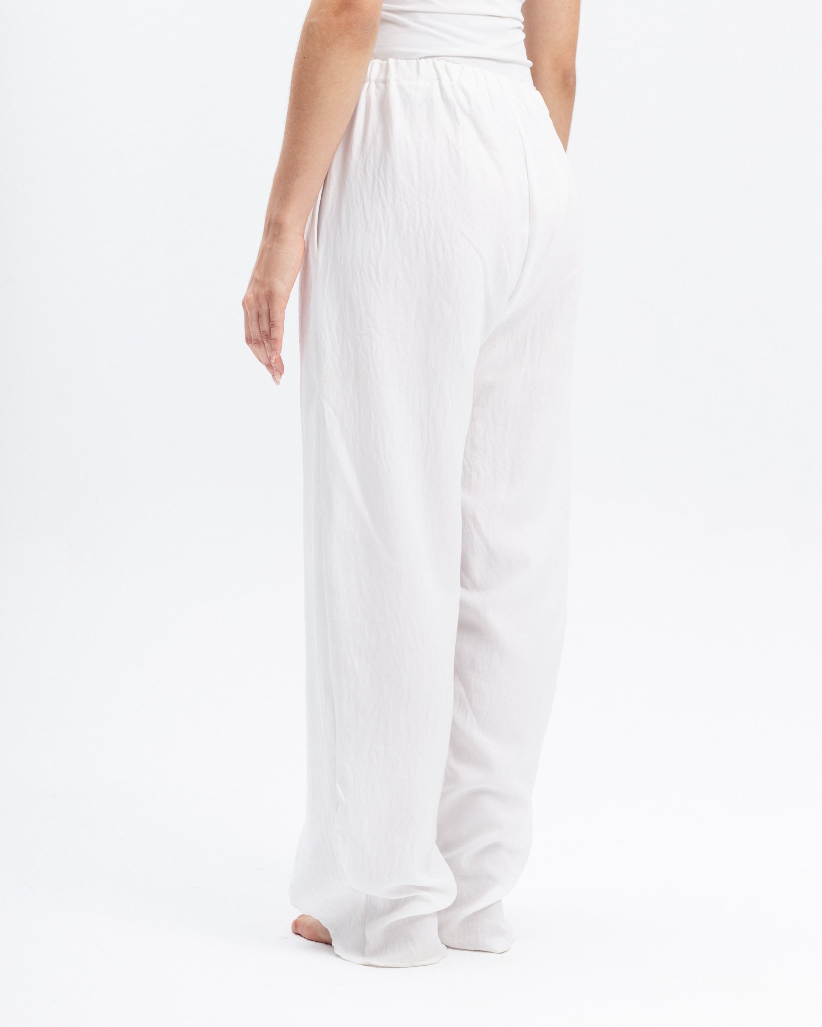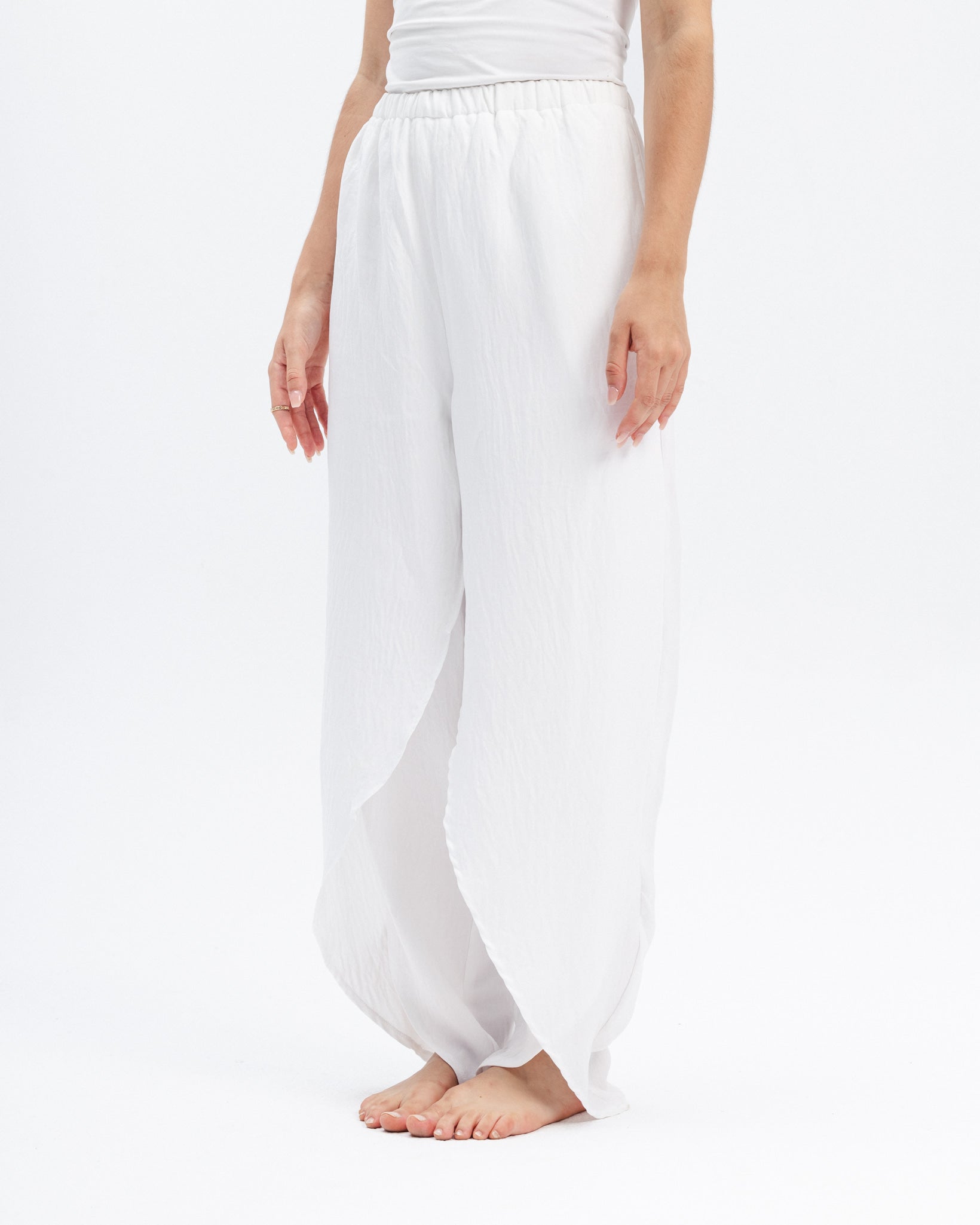 Wide-leg pants crafted from a lightweight linen-blend fabric with a crinkled texture. Designed with a soft elasticated waistband and overlapping tulip hem for added movement.