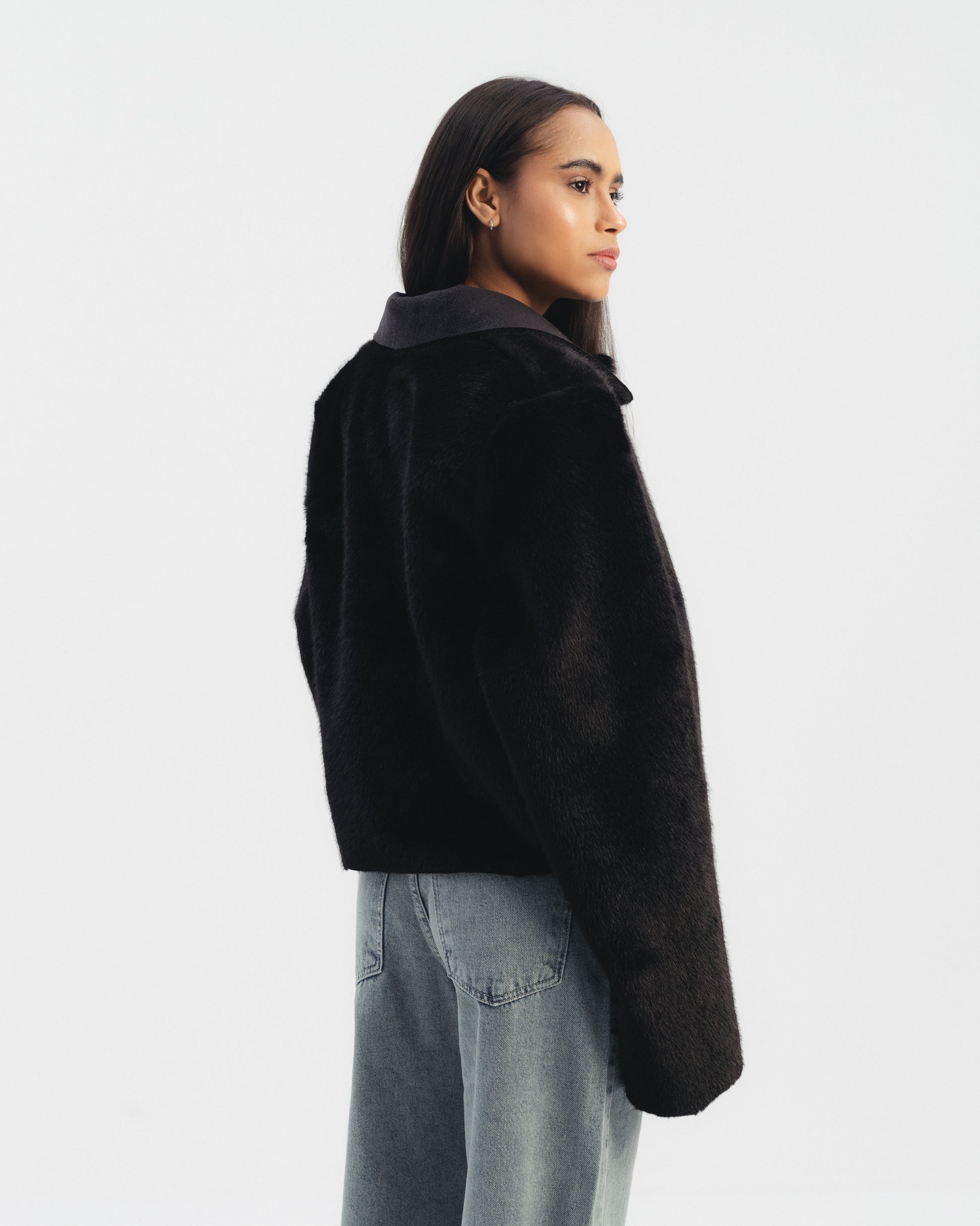 Double faced jacket designed to be worn on both sides. Features a structured silhouette with a soft shearling finish on one side and a smooth exterior on the other. Long sleeves and clean front closure. Cropped length.