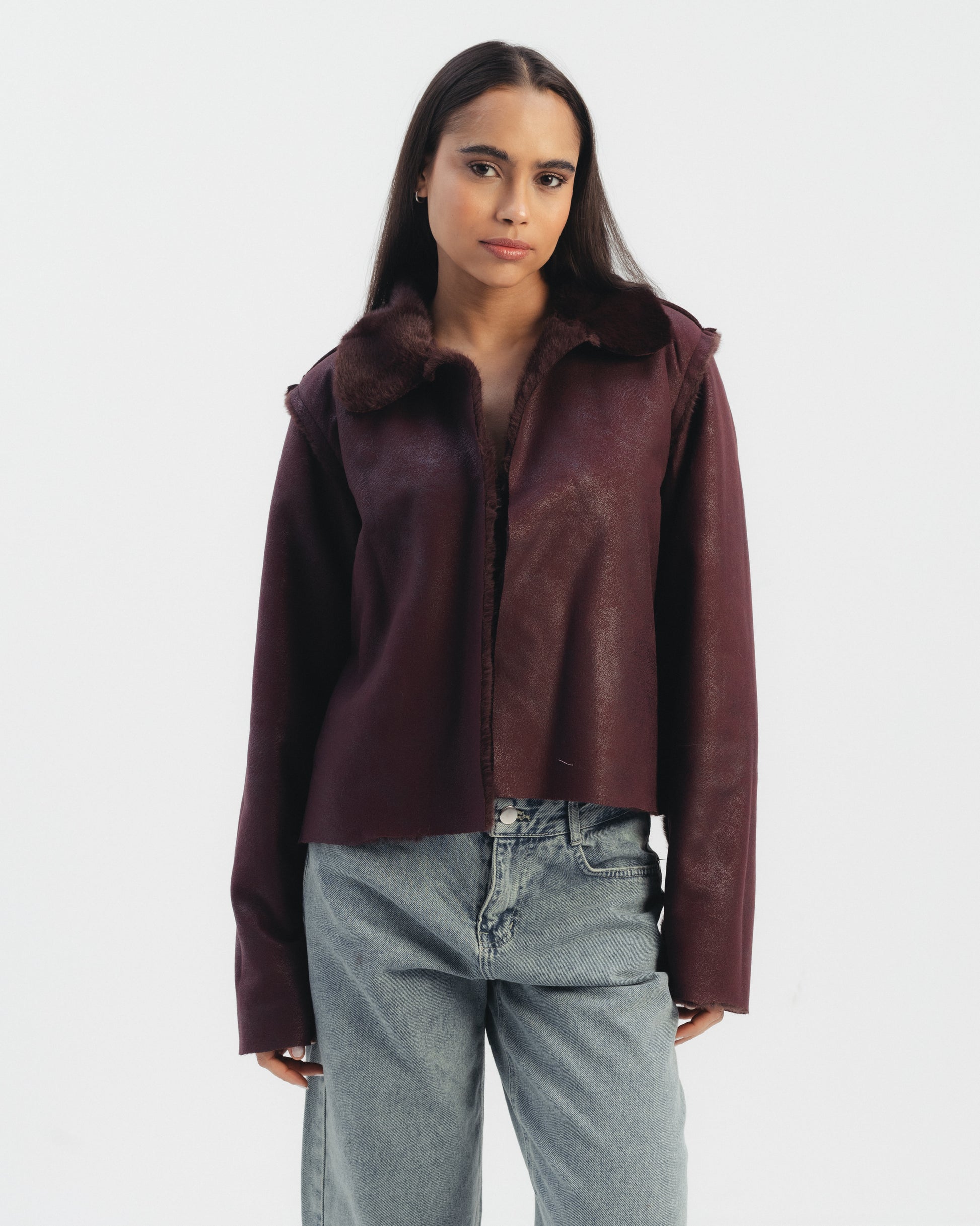 Double faced jacket designed to be worn on both sides. Features a structured silhouette with a soft shearling finish on one side and a smooth exterior on the other. Long sleeves and clean front closure. Cropped length.