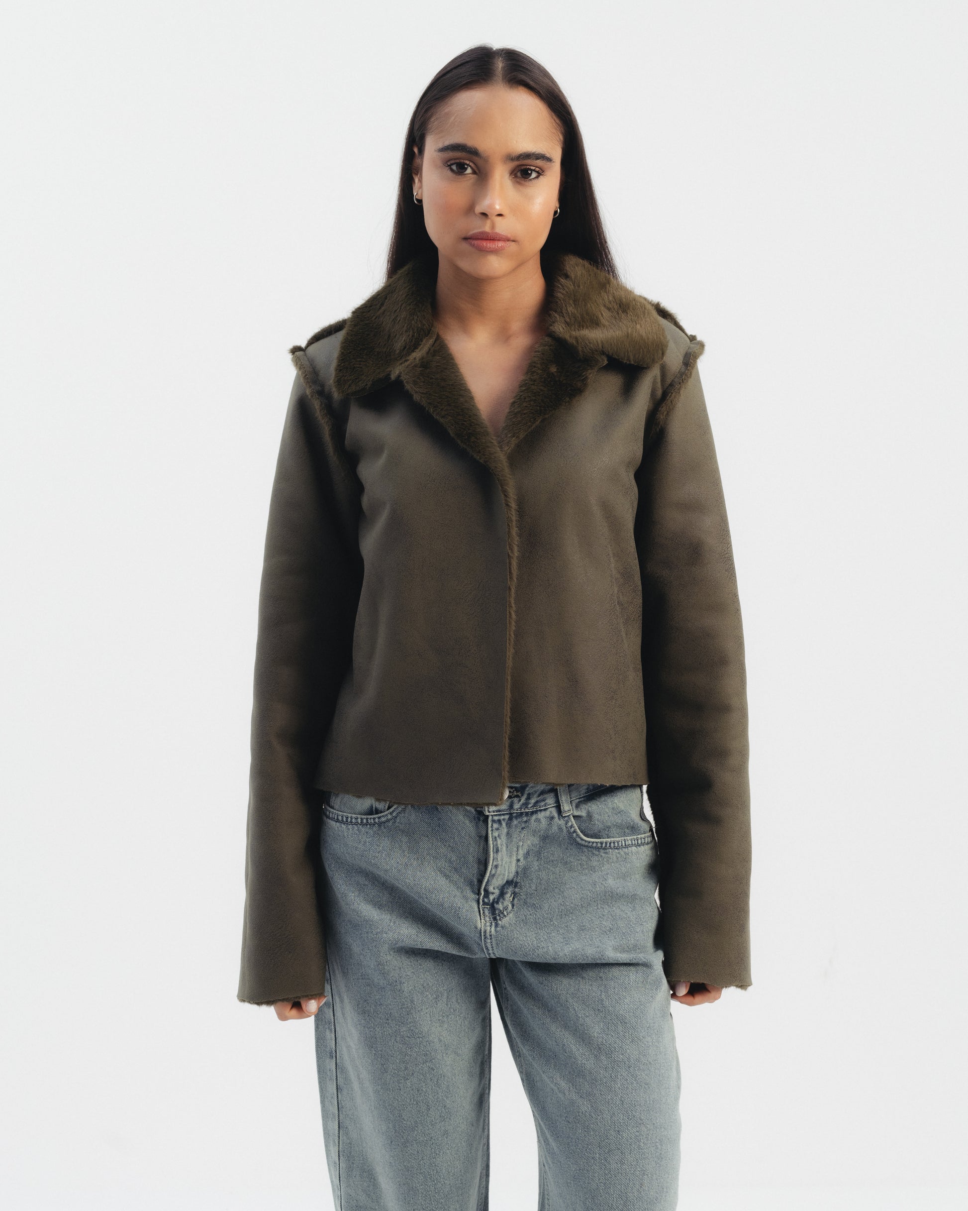 Double faced jacket designed to be worn on both sides. Features a structured silhouette with a soft shearling finish on one side and a smooth exterior on the other. Long sleeves and clean front closure. Cropped length.