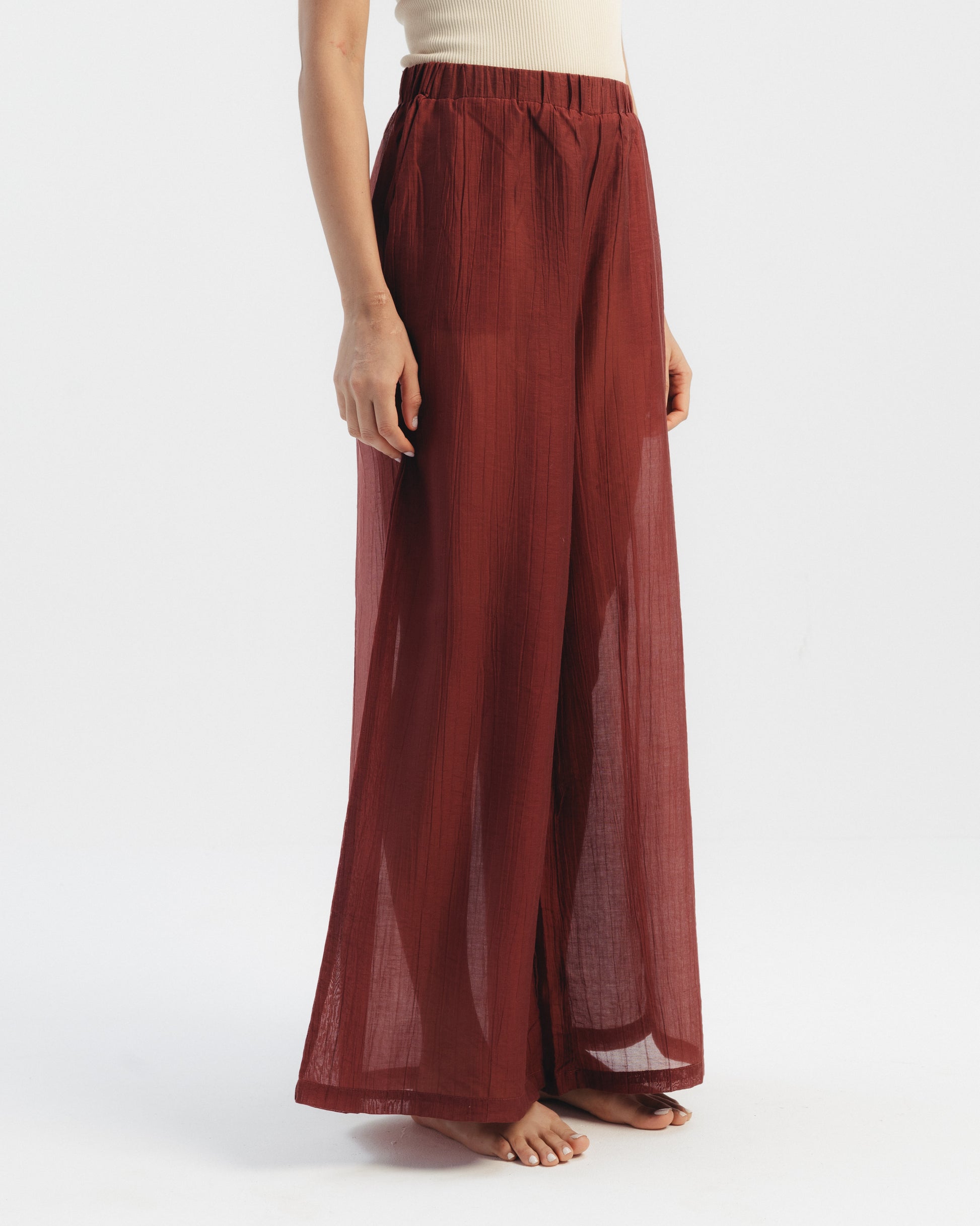 Two-piece set featuring a high neck sheer blouse with ruffle detailing and layered hem. Paired with matching wide leg trousers. Lightweight fabric with soft movement. Relaxed fit.