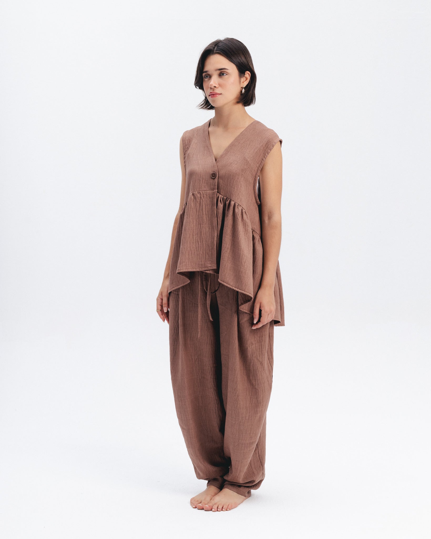 V-neck sleeveless top made from a textured linen-blend fabric in a warm brown tone. Features a single front button, gathered waist seam, and an asymmetric draped panel at the front.