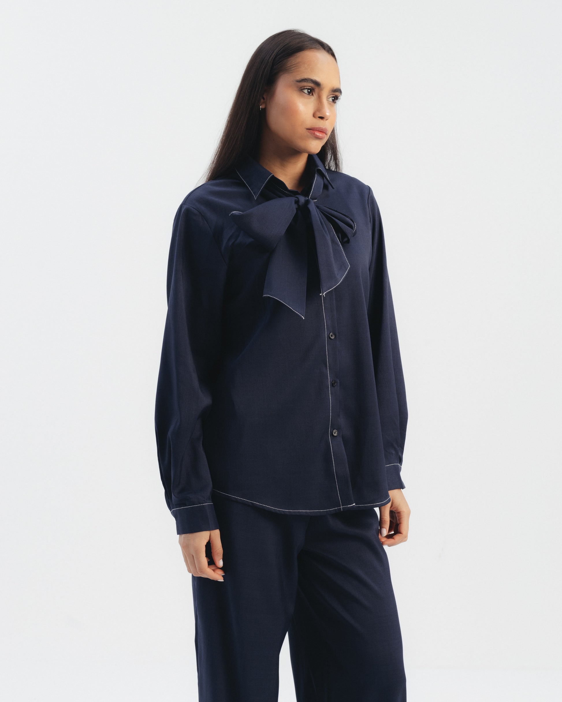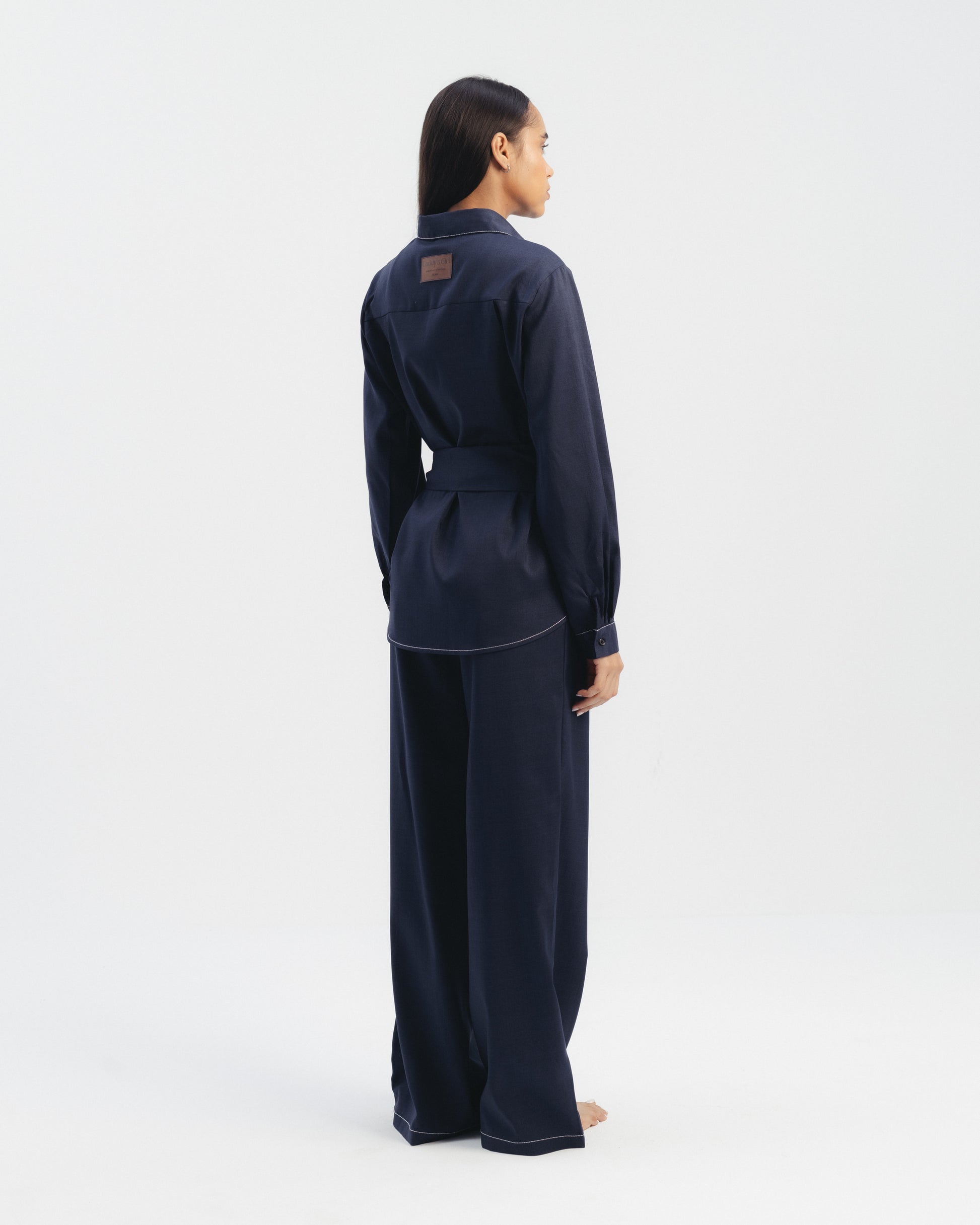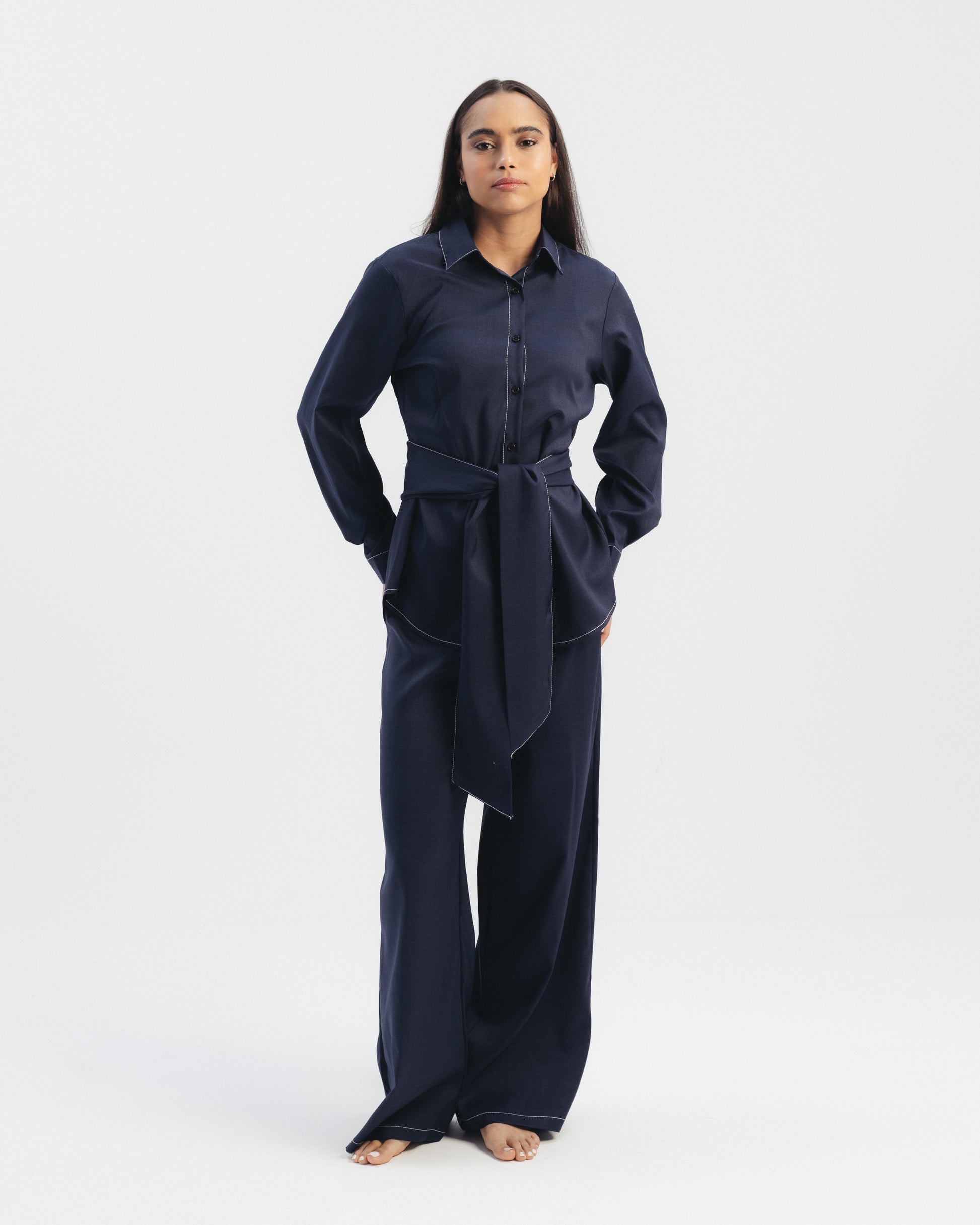Two-piece set featuring a long sleeve button-up shirt with contrast stitching and matching wide leg trousers. Designed with a detachable waist belt for a defined silhouette. Structured fit with a clean, tailored finish.