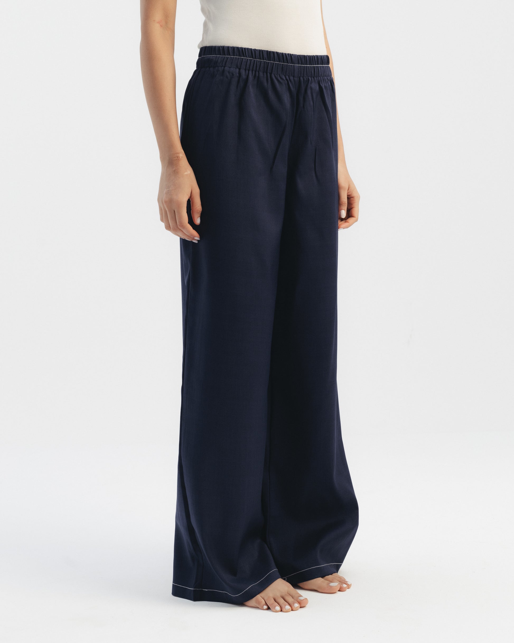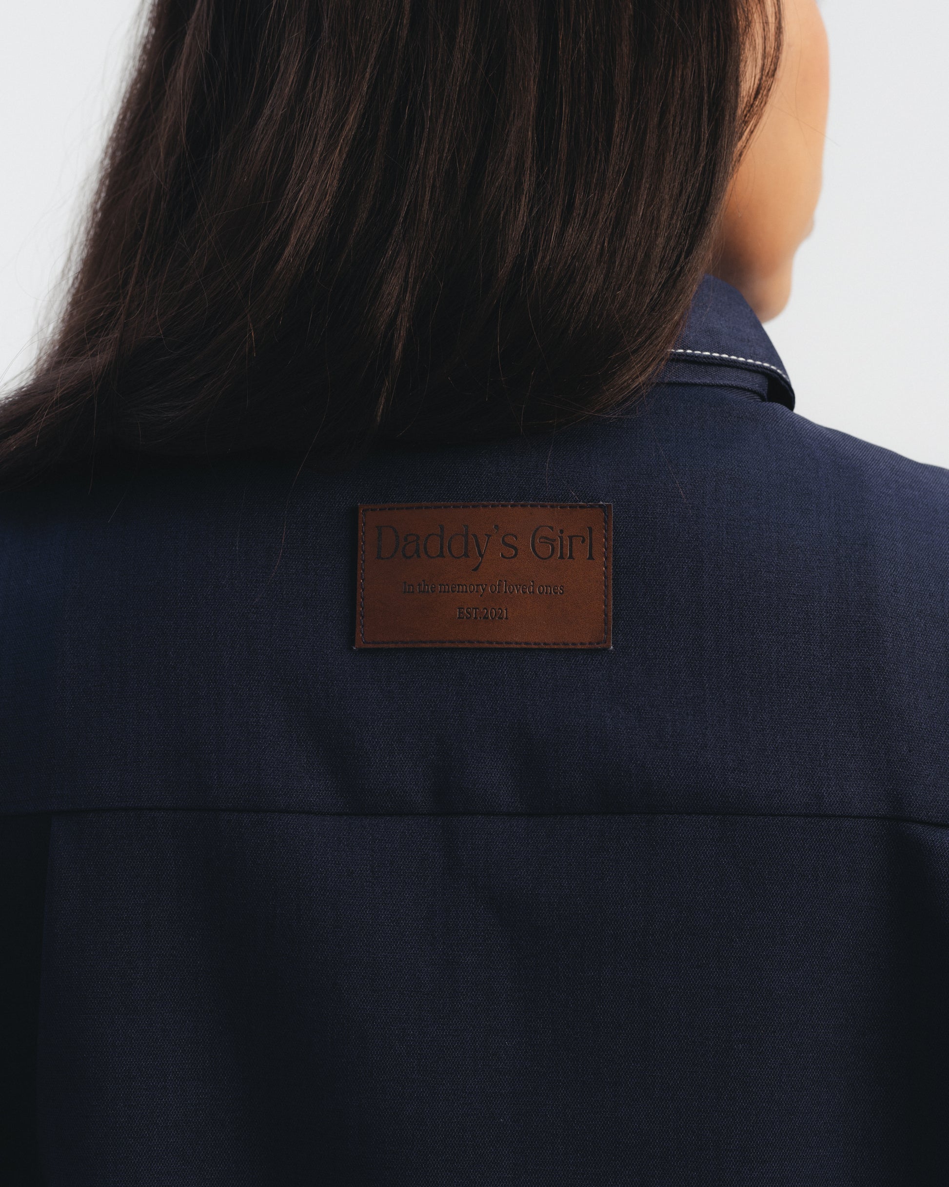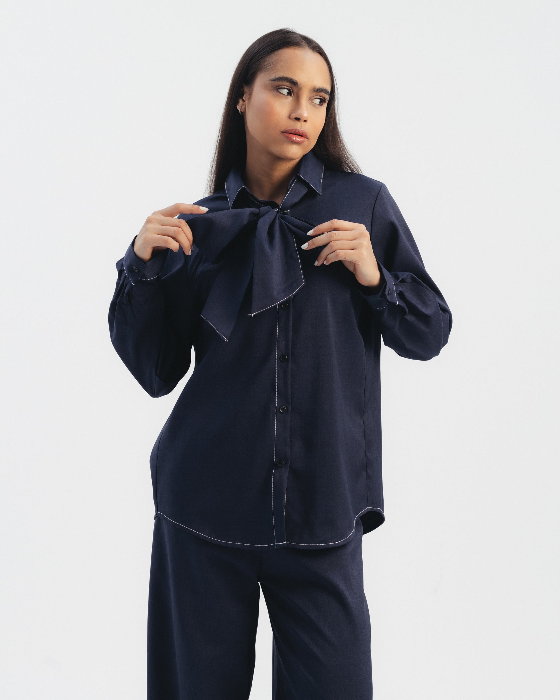 Two-piece set featuring a long sleeve button-up shirt with contrast stitching and matching wide leg trousers. Designed with a detachable waist belt for a defined silhouette. Structured fit with a clean, tailored finish.